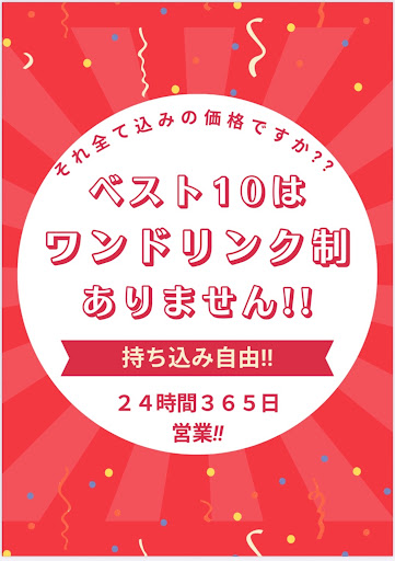 ベスト10にはカラオケで良くあるワンドリンク制は一切ありません‼ 料金表のお部屋代だけで利用できます♪ 無料のポップコーンや、ドリンクご希望の方は別途安くて美味しい種類豊富なドリンクバーもございます!! お飲み物、お食事の持ち込みも完全無料なので自分スタイルでぜひお楽しみください!